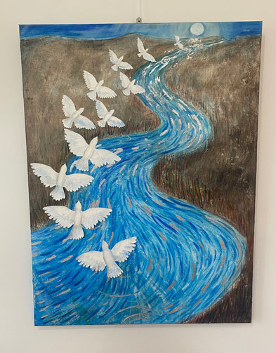 White hand-painted and hand-cut doves are flying against the current of the river. This composition captures the movement of the doves, as they diminish into the blue sky.