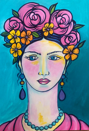 The Frida Kahlo inspired subject of Young Woman with Roses 2 captures how vibrant colours can evoke emotion and mood. This composition explores the balance of feminine energy and inner strength.