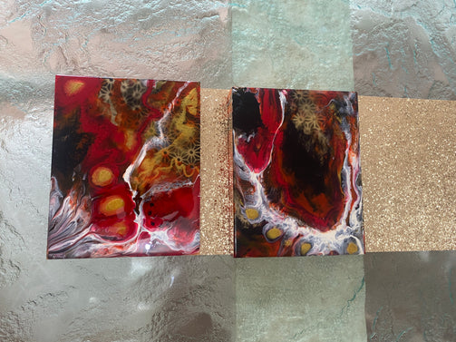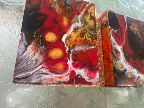 This is an intuitive application and manipulation of the resin medium depicting a cataclysm of pigment colours. The pigment and resin are on a board ready to hang.