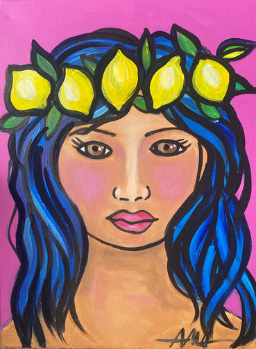 Sicilian Woman with Lemons is from a collection of colourful portraits. Reminiscent of young Sicilian girls and the imagery gained from travels and Sicilian heritage.